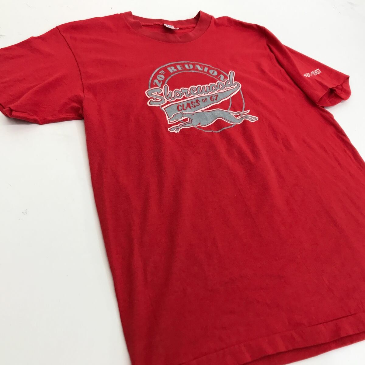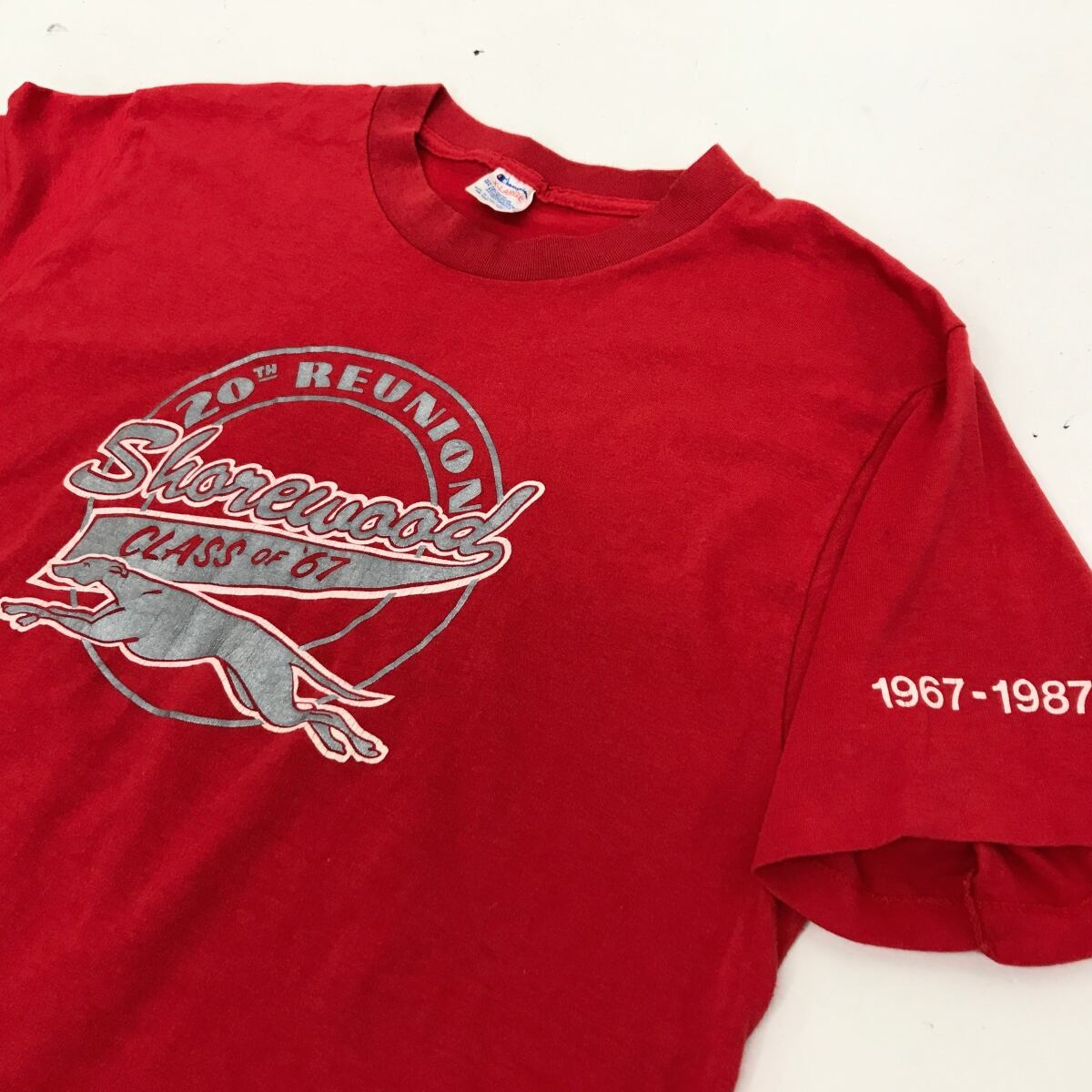 CHAMPION チャンピオン 80年代 USA製 後期 トリコタグ SHOREWOOD GREYHOUNDS ロゴ プリント Tシャツ レッド X-LARGE 表記 半袖 | 古着屋 EAGLEBASE