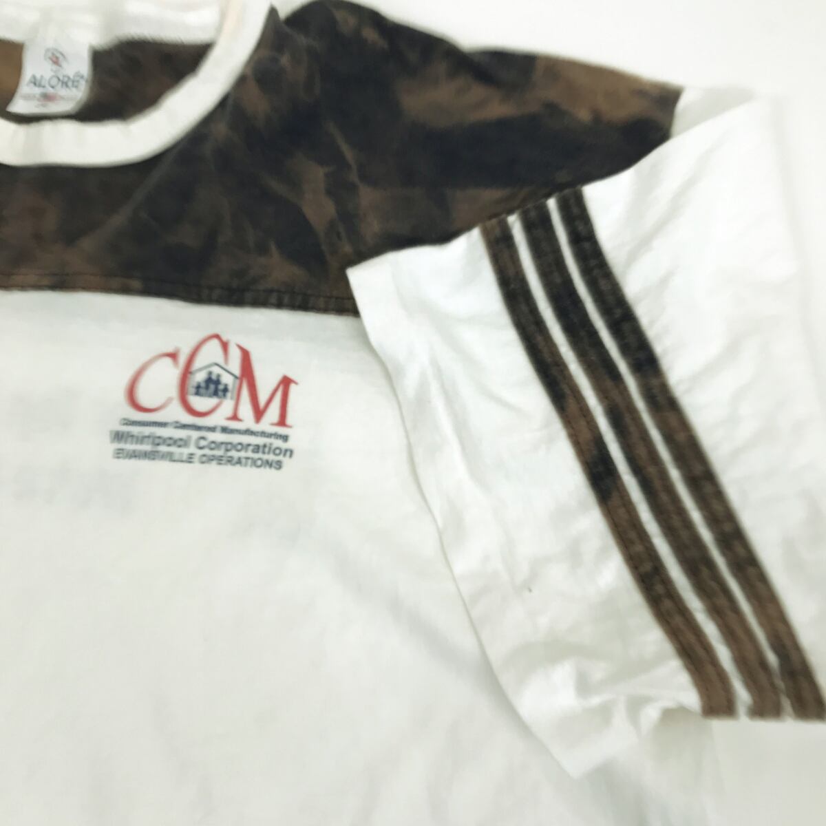 ALORE アローレ 80〜 90年代 USA製 WHIRLPOOL CORPORATION 企業 アドバタイジング Tシャツ タイダイ ブリーチ フットボール Tシャツ ホワイト ブラウン 2XL 表記 半袖