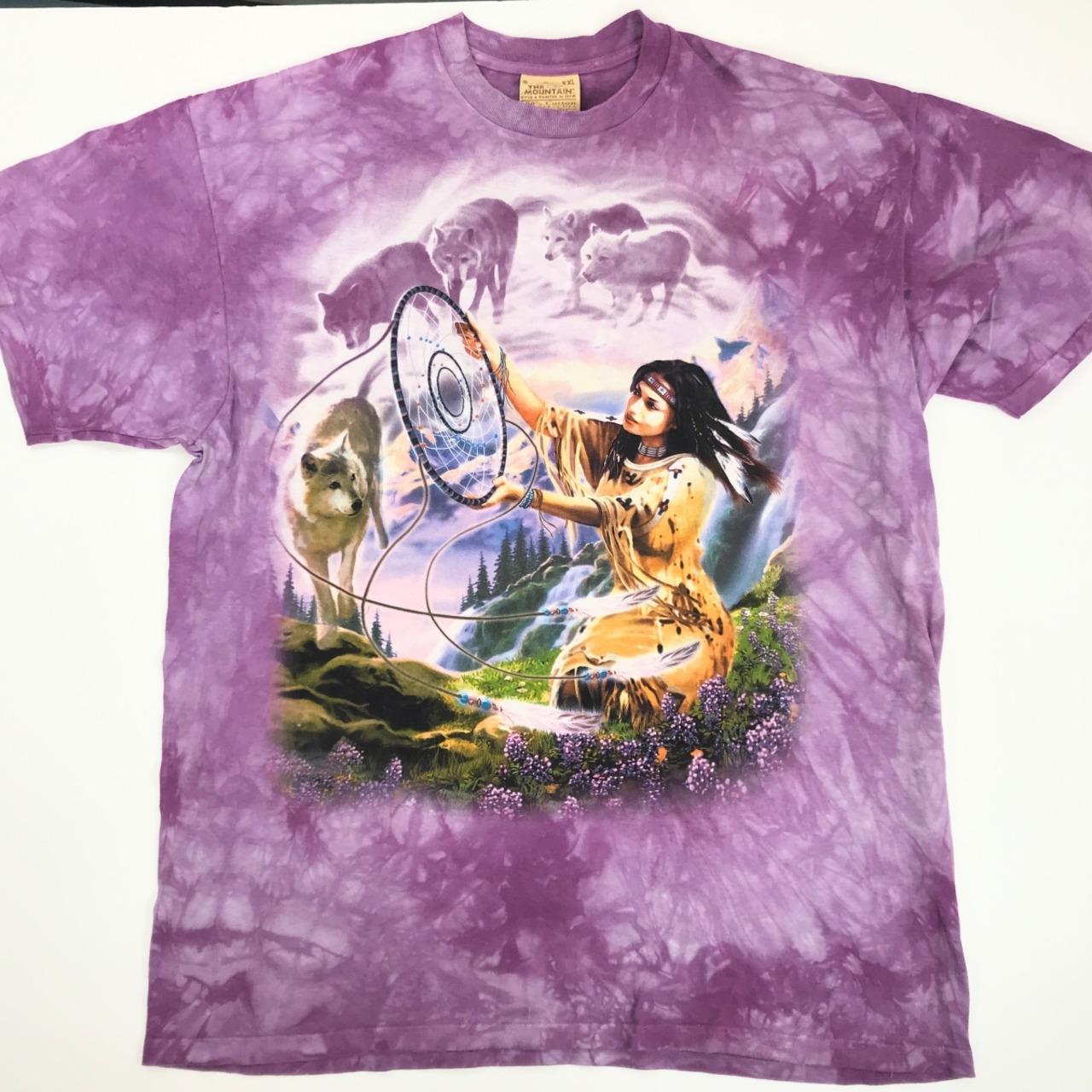 THE MOUNTAIN ザ マウンテン 00年代 ASIBIKAASHI ネイティブ アメリカン & ウルフドリームキャッチャー アートプリントTシャツ タイダイ Tシャツ パープル XXL 表記 半袖