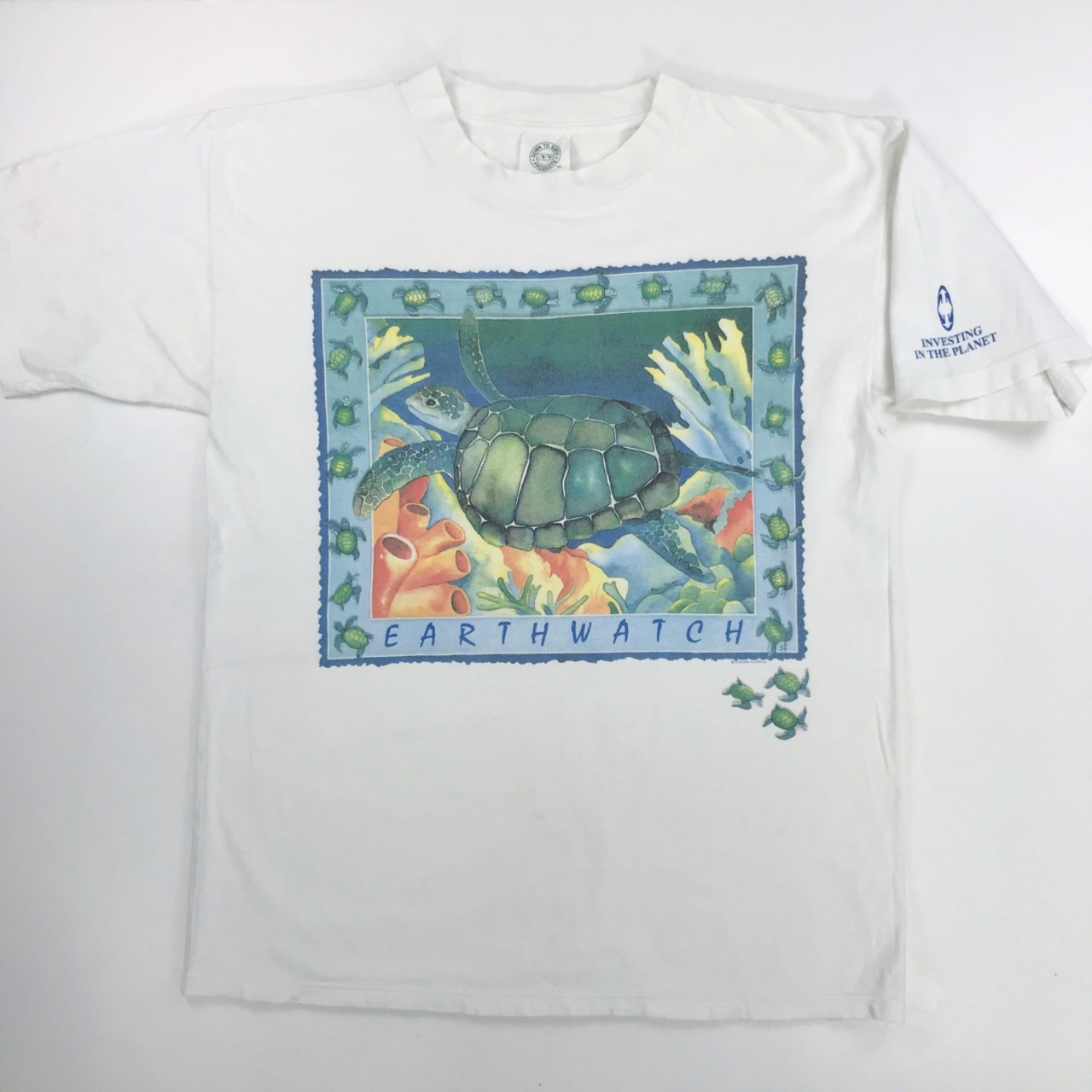 DOWN TO EARTH PRODUCTS 90年代 USA製 EARTHWATCH CHERIE FLIPPEN SEA?? TURTLE アートTシャツ ウミガメ アニマル Tシャツ ホワイト XL 位 半袖