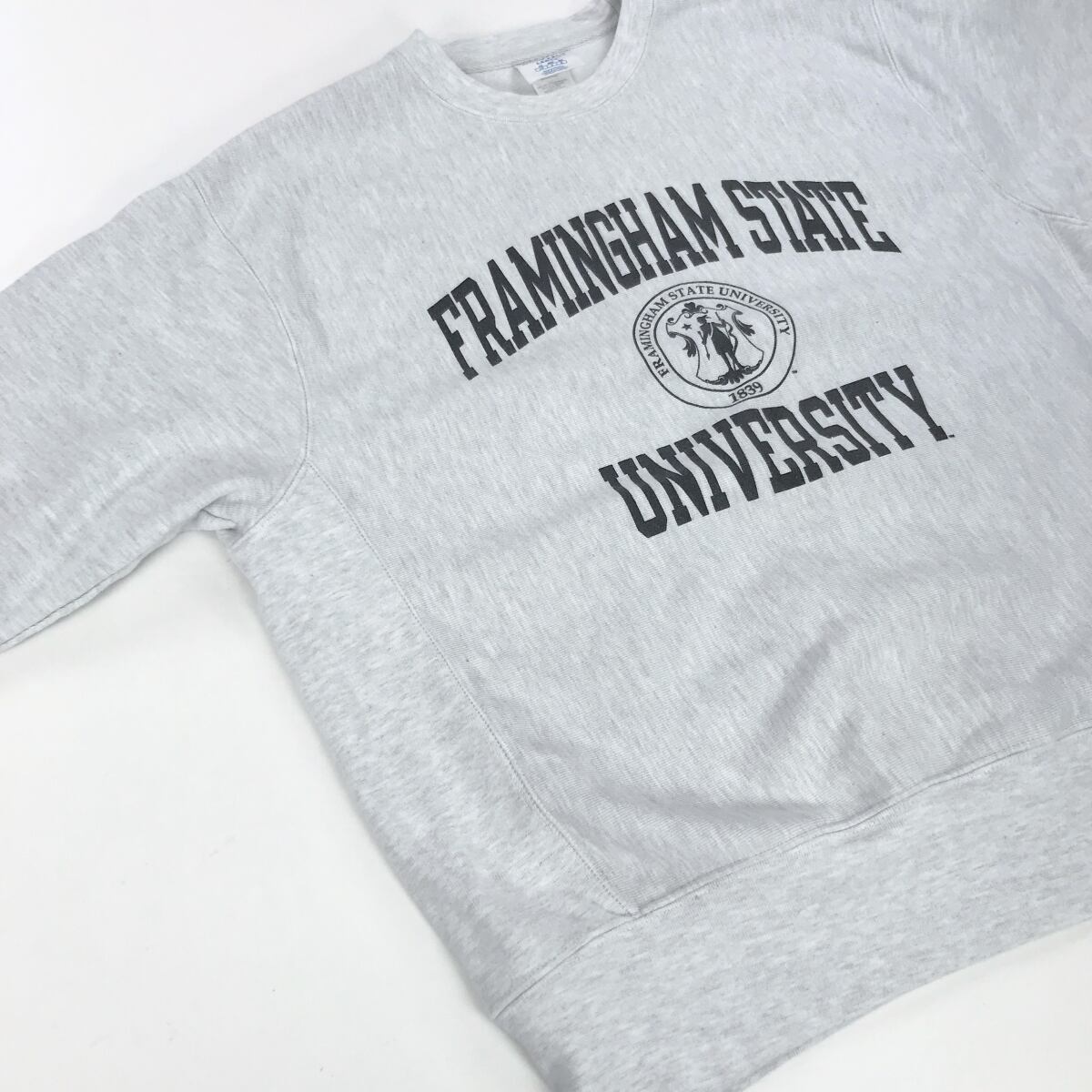 CHAMPION チャンピオン 00年代 リバースウィーブ FRAMINGHAM STATE UNIVERSITY 3段 カレッジ ロゴ プリント スウェット 復刻 単色タグ 袖目あり ライト アッシュグレー LARGE 表記 長袖