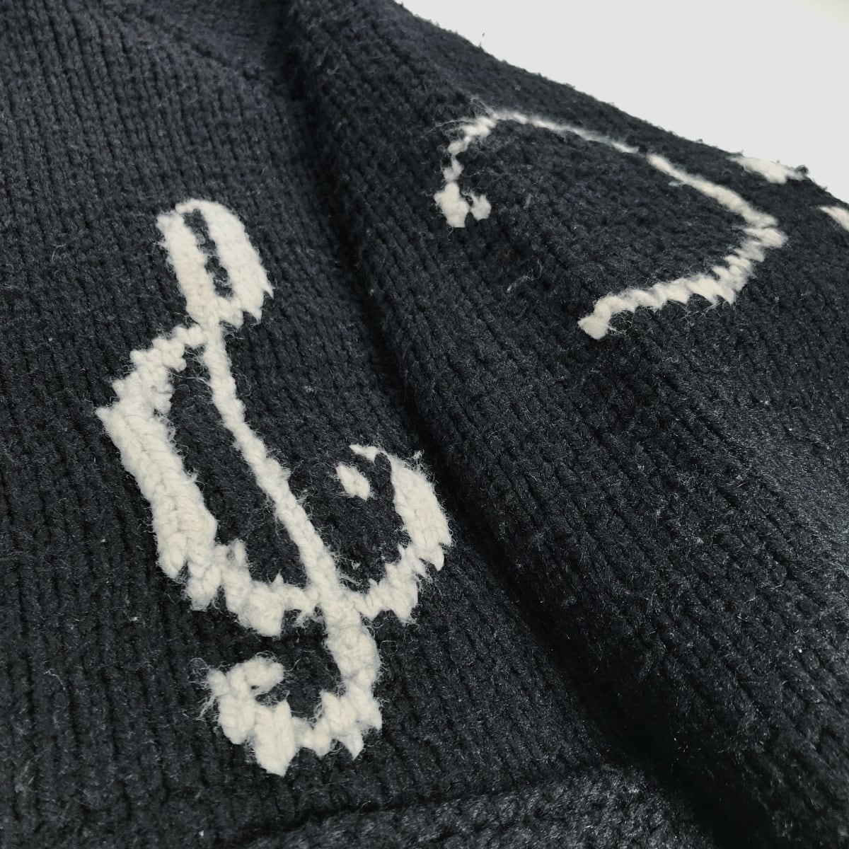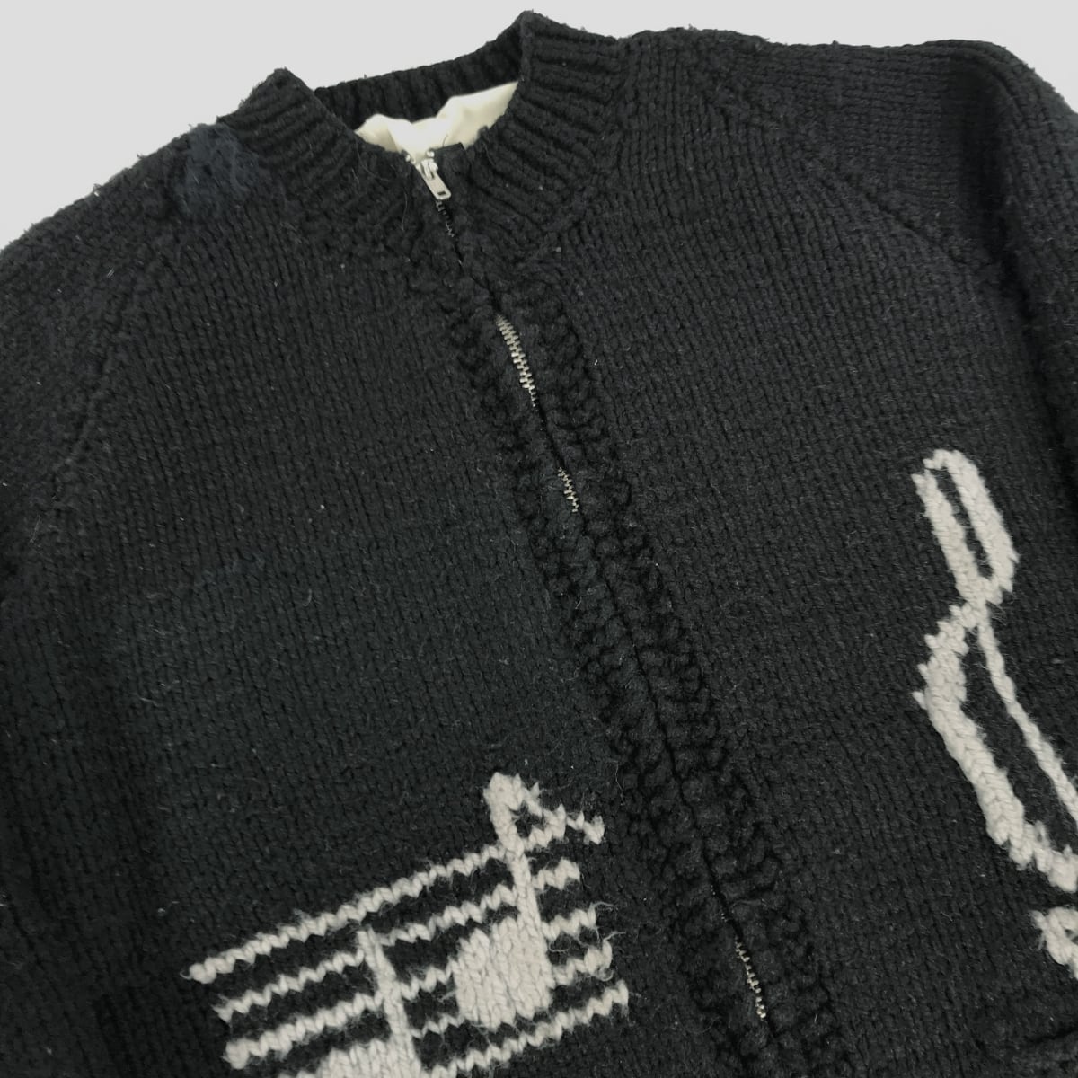 US VINTAGE 60年代あたり 楽譜 音符柄 スタンドカラー 棒 TALON ジッパー カウチン セーター ブラック L位 長袖